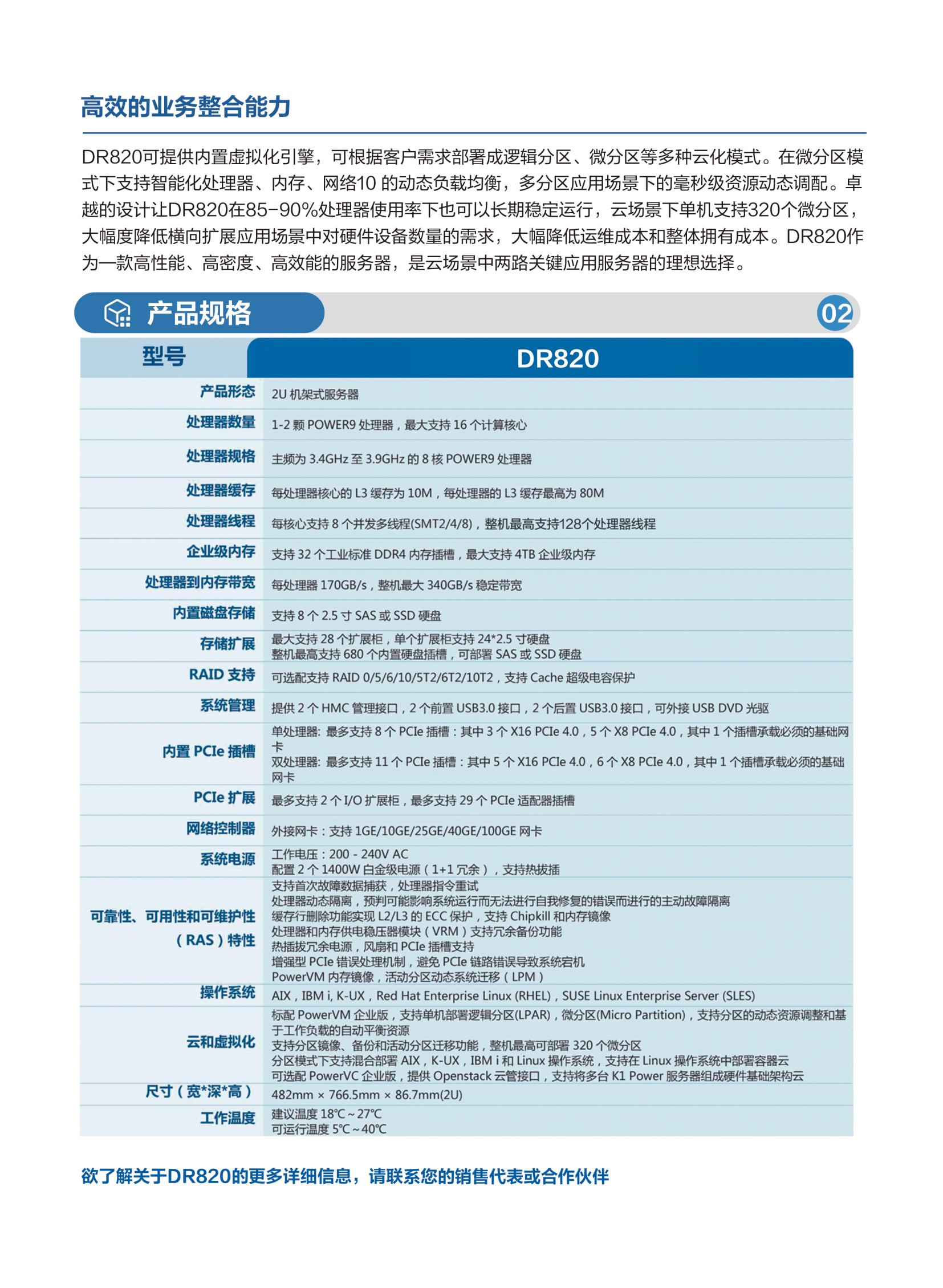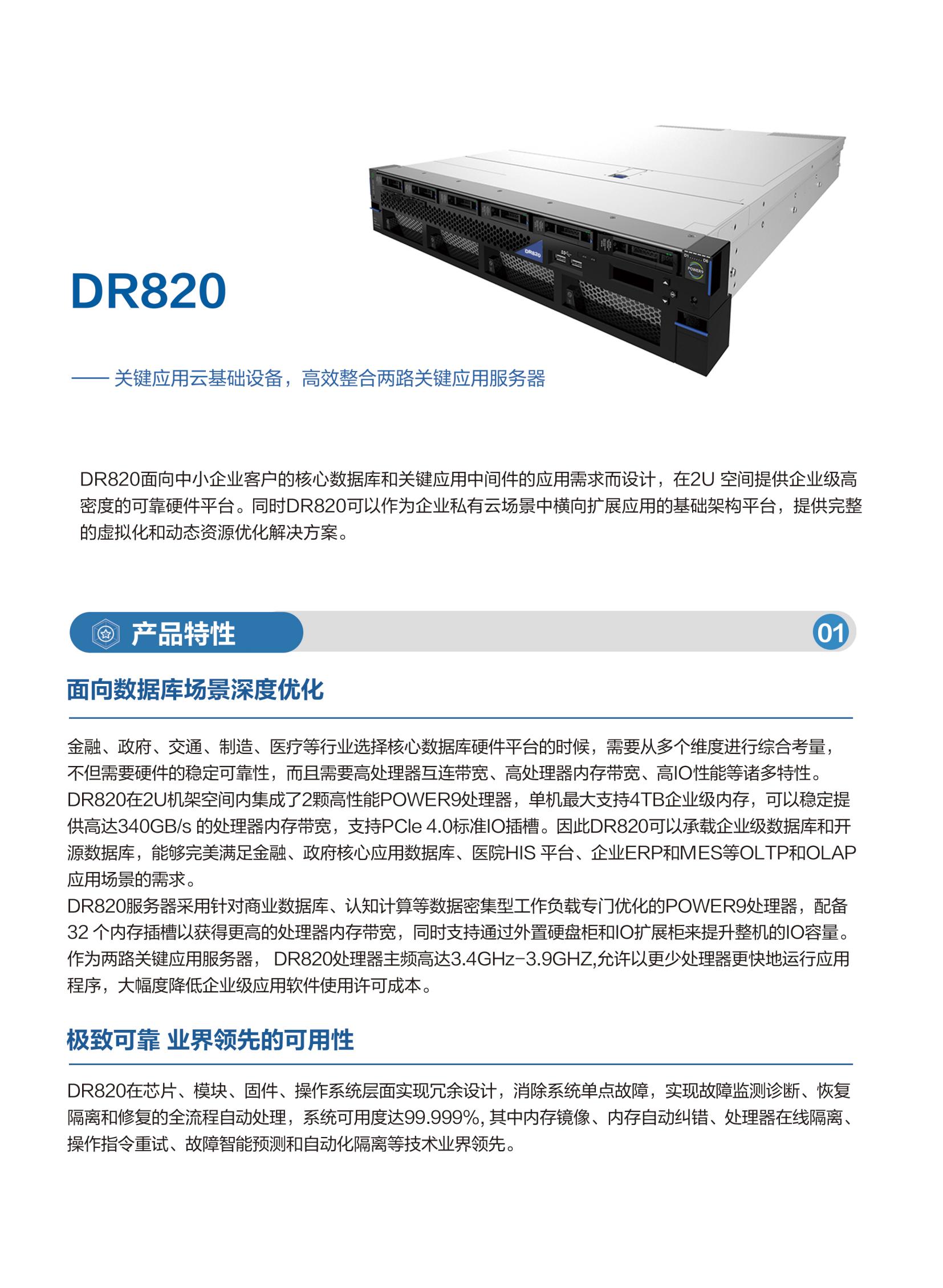 DR820面向中小企业客户的核心数据库和关键应用中间件的应用需求而设计,在2U 空间提供企业级高密度的可靠硬件平台。同时DR820可以作为企业私有云场景中横向扩展应用的基础架构平台,提供完整的虚拟化和动态资源优化解决方案。