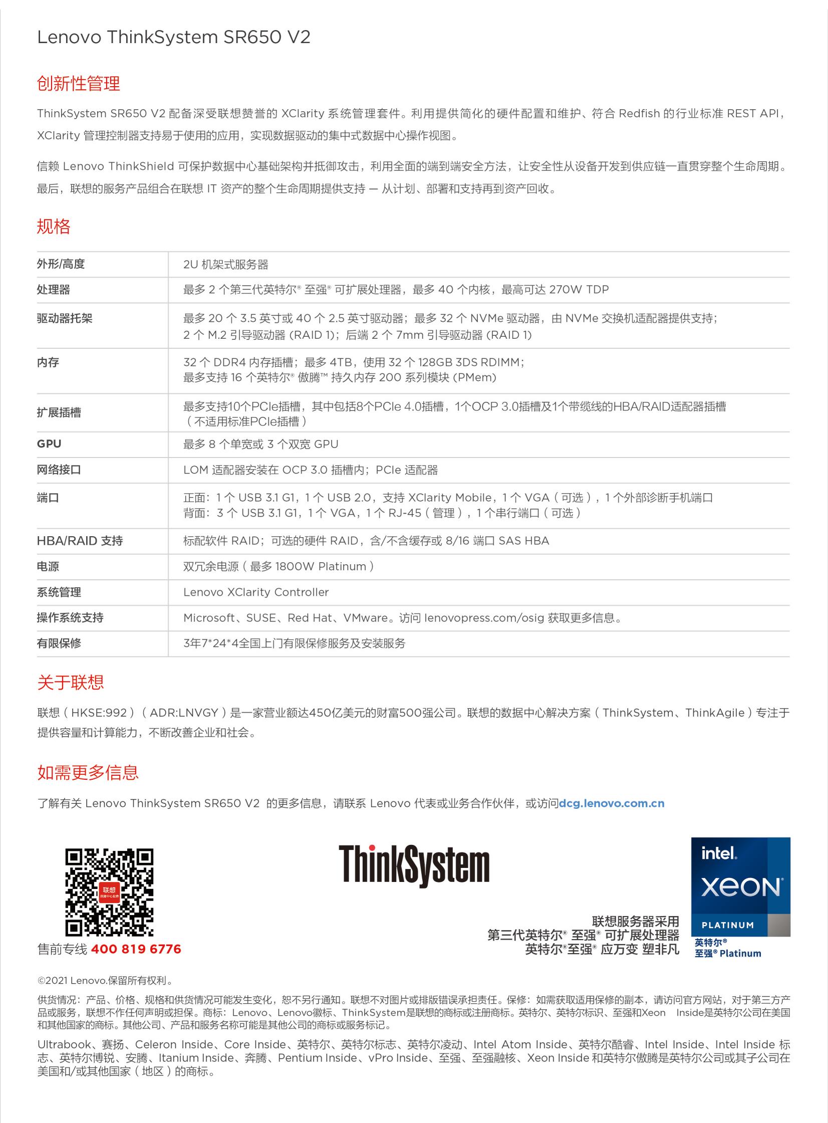 联想 ThinkSystem SR650 V2